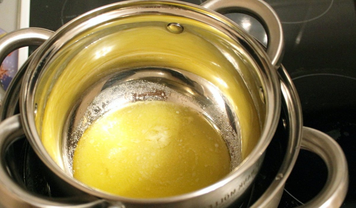 Rozpuść masło w rondelku na małym ogniu. Do rozpuszczonego masła dodaj miód i mieszaj od czasu do czasu żeby masa się nie zagotowała.