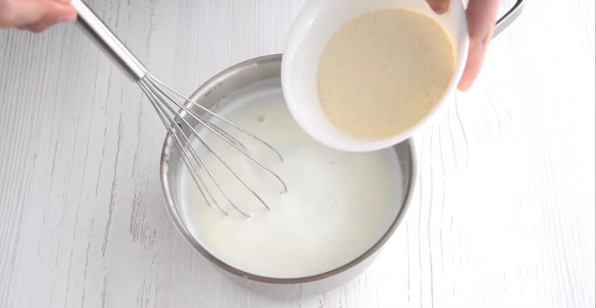 Zacznij od nadzienia. W małym rondelku wymieszaj zimne mleko, masło, cukier i mak. Zagotuj na średnim ogniu, dobrze mieszaj. Następnie do gorącej mieszanki dodaj porcjami kaszę mannę, mieszaj energicznie. Pilnuj, aby nie pojawiły się grudki. Odstaw garnek na bok na około 20 minut.
