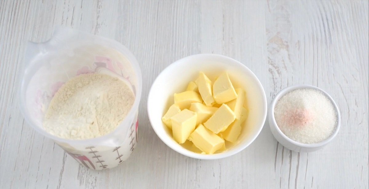 W misce wymieszaj twaróg, jajko i dodaj szczyptę soli. Następnie składniki dobrze ubij blenderem na gładką masę. Jeśli chcesz, możesz dodać trochę ekstraktu waniliowego. Przesiej mąkę przez sito. Drobno posiekaj twarde masło nożem. Następnie wymieszaj je z mąką i cukrem. Dodaj również szczyptę soli.
