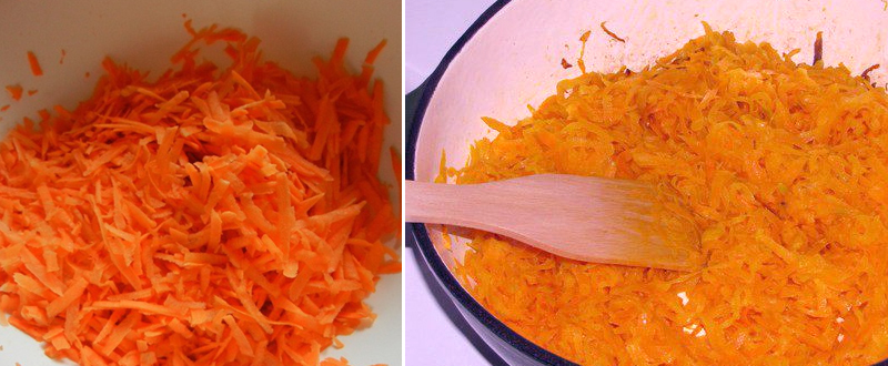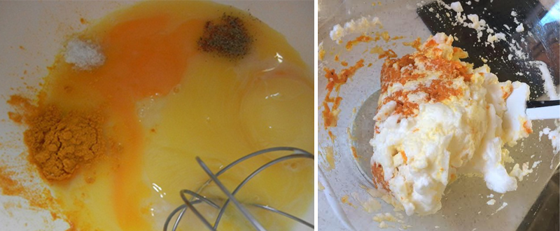 Do drugiej miski przełóż żółtka, kurkumę i przyprawy i również zacznij ubijać. Do ubitych żółtek przełóż ostudzoną, podsmażoną na patelni marchew i dokładnie wymieszaj.