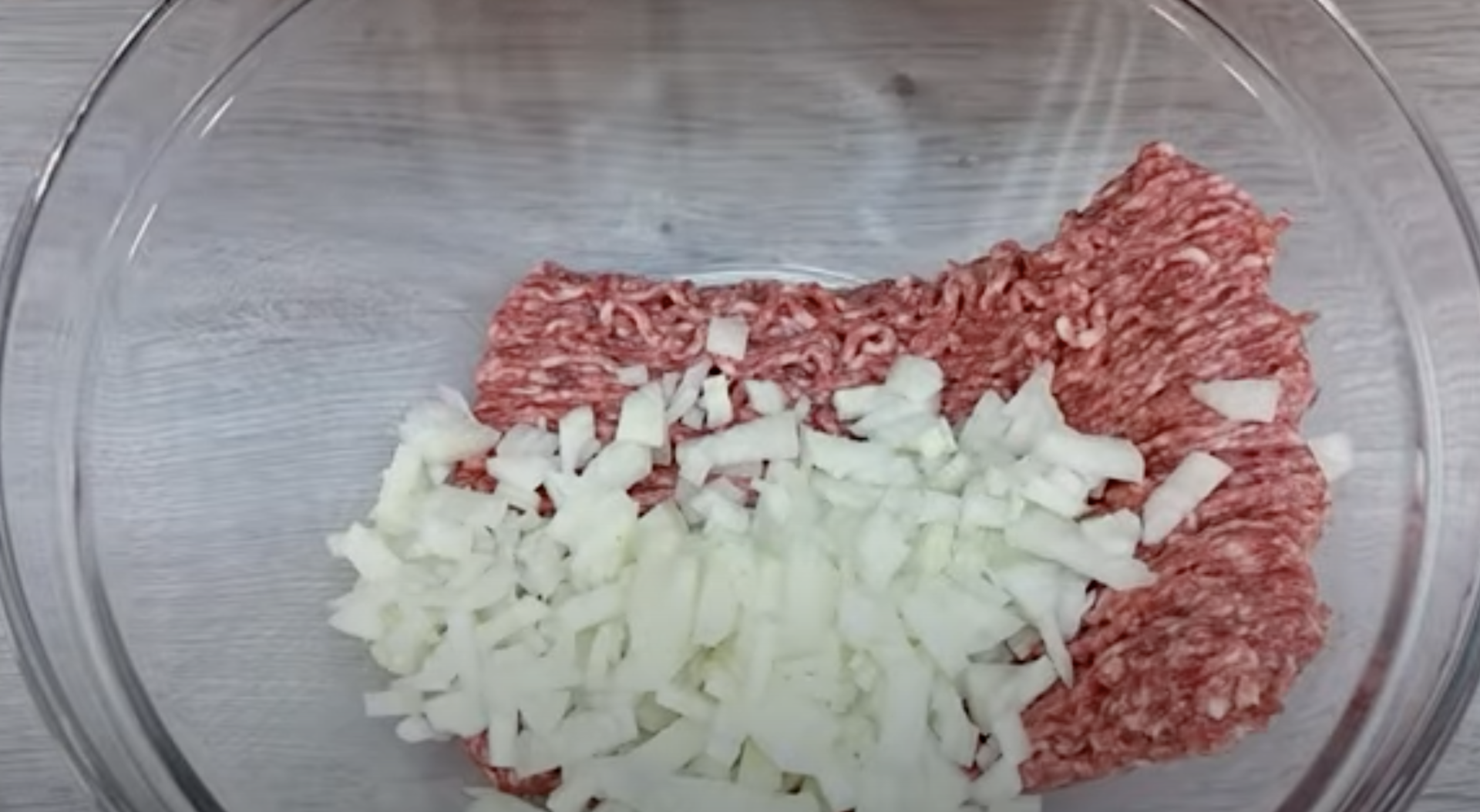 Cebulę kroisz w drobną kostkę i mieszasz z 500 g mielonego mięsa.