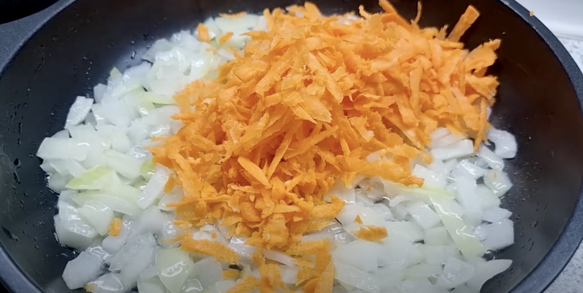 Na rozgrzanej patelni podsmażasz cebulę do złotego koloru, dodajesz startą marchewkę i smażysz przez 5 minut.
