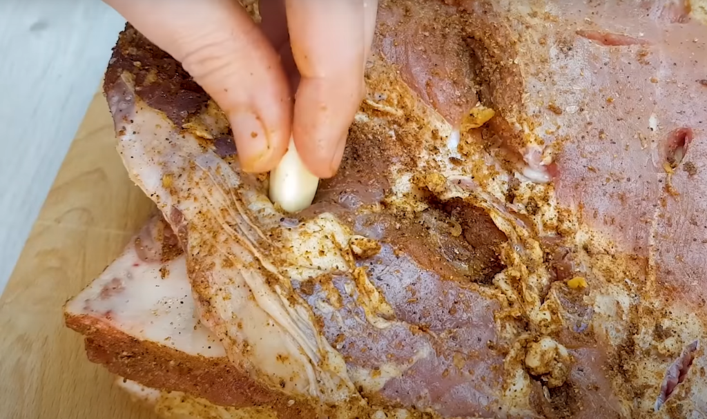 Przygotuj w małej misce mix: zmielony pieprz, czerwoną paprykę, sól i suszony czosnek. Użyj tej mieszanki, aby dobrze natrzeć boczek. Resztę czosnku? Wsuń go do mięsa, robiąc nacięcia nożem.