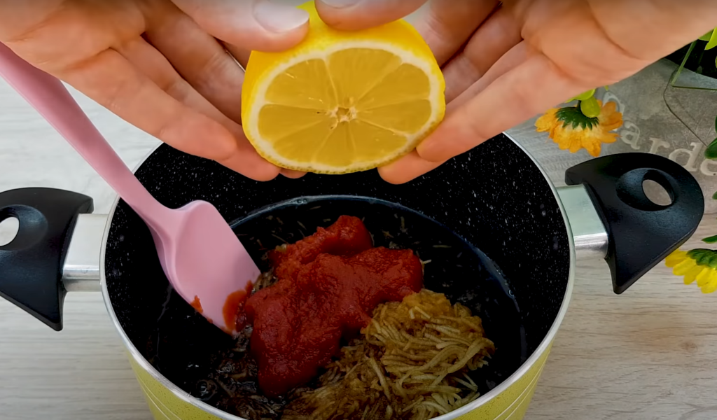 Podczas gdy boczek się piecze, przygotuj marynatę. Jabłko zetrzyj na tarce i wymieszaj z koncentratem pomidorowym, sokiem z cytryny i sosem sojowym. Dodaj resztę przypraw i gotuj, aż uzyskasz gładką konsystencję.