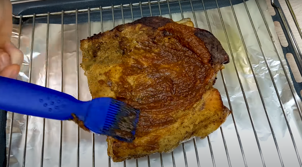 Po upływie dwóch godzin pieczenia, odkryj mięso, nałóż na nie marynatę i przenieś na grill. Boczek grilluj przez około 5 minut w 220 stopniach.