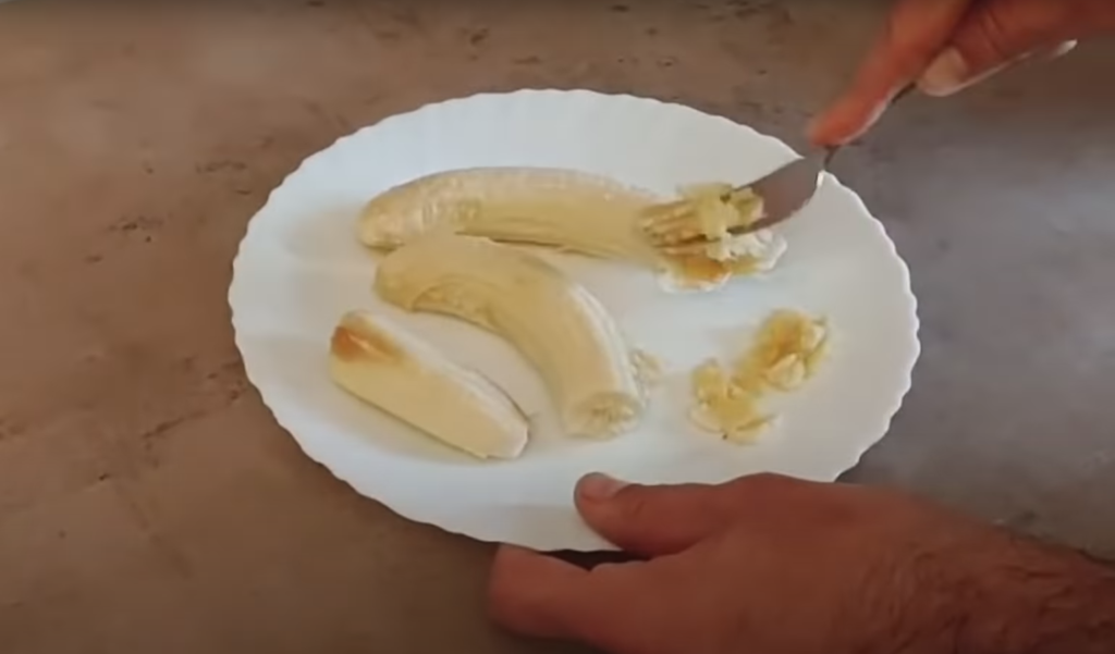 Obydwa banany obieramy ze skórki i za pomocą widelca robimy puree bananowe.