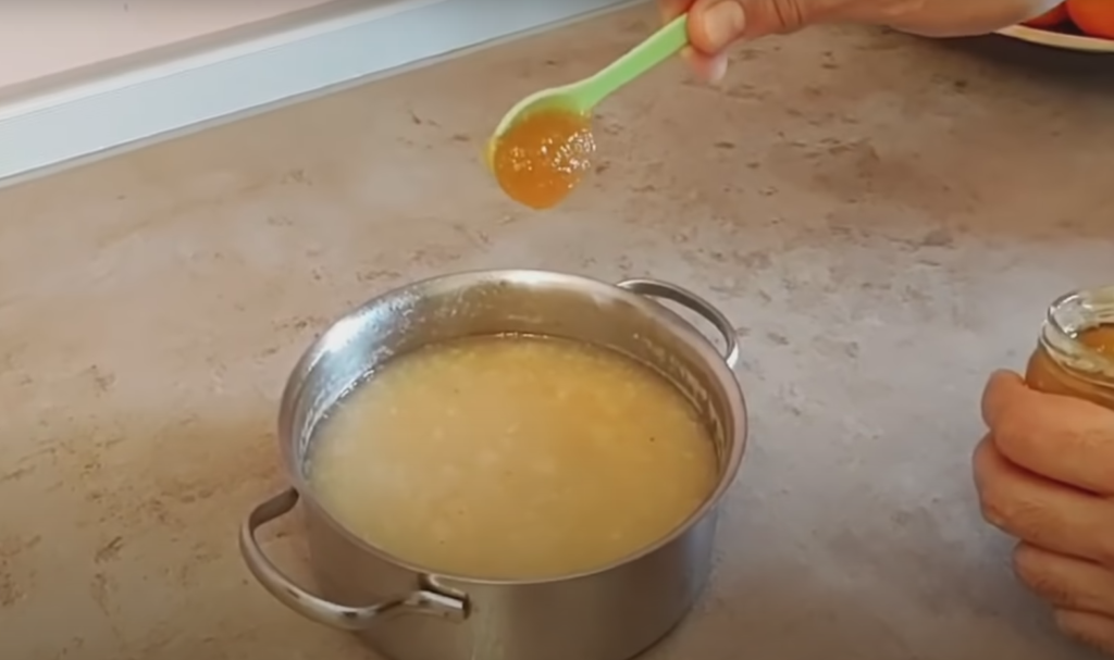 Gdy składniki są ciepłe, ale nie gotują się już, dodajemy dwie łyżki miodu.
