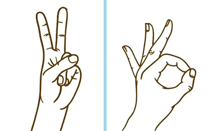 Jeśli akurat nie masz pod ręką niczego do pisania, wypróbuj podobne ćwiczenie angażujące tylko twoje dłonie. Palce prawej dłoni ułóż w znak „V”, a lewej w „OK”.
