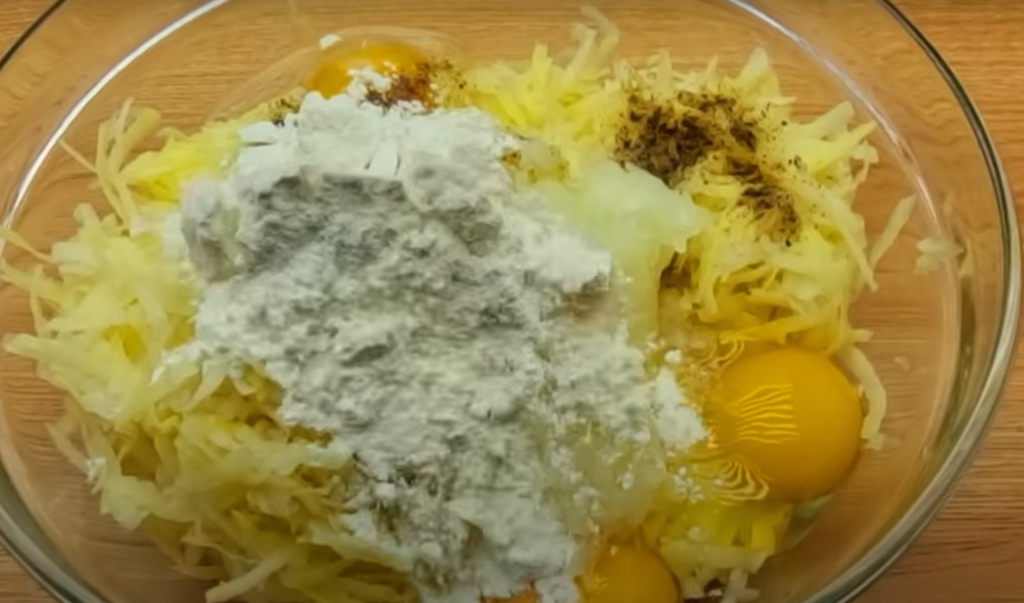 Ziemniaki odciśnij z wody i przełóż do suchej miski. Do środka wbij 3 jajka, dodaj startą cebulę, mąkę pszenną, sól i pieprz. Wszystko dokładnie wymieszaj.