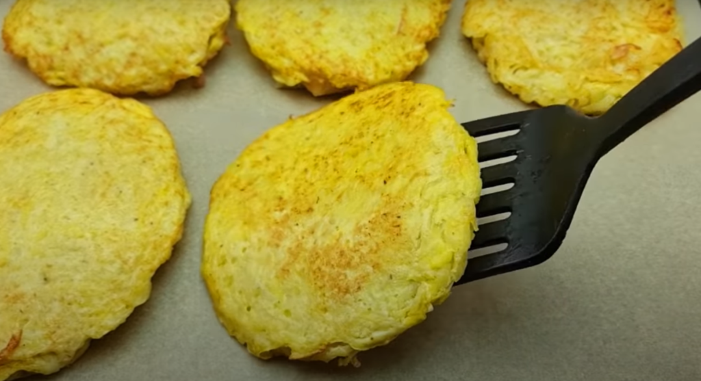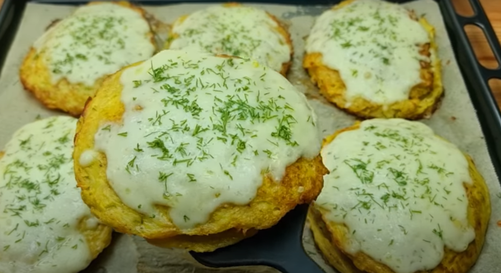 Usmażone placki ułóż na wyłożonej papierem do pieczenia blasze i wstaw do nagrzanego piekarnika. Piecz je przez 20-25 minut. Ser zetrzyj i posyp nim placki, po czym pozwól im się piec aż do rozpuszczenia sera, przez koło 5-7 minut. Tak przygotowane danie możesz posypać koperkiem i podawać.