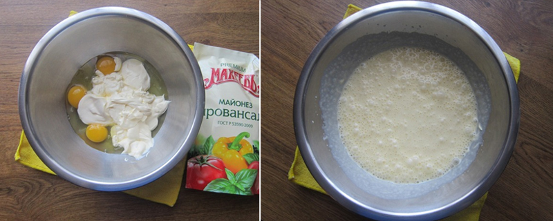 W wysokiej misce, za pomocą miksera, połącz wszystkie składniki mokre tj. wodę, jajka, majonez i olej. Stopniowo do naczynia dodawaj wymieszane składniki suche. tj. mąkę z solą i ew. cukrem, po czym odstaw ciasto na ok. 20 min.