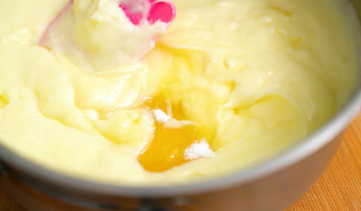 Połącz jajka, skrobię i trochę pozostałego mleka na gładką masę. Teraz wlej pozostałe mleko i zamieszaj. Umieść miksturę na średnim ogniu i gotuj cały czas mieszając. Po zagotowaniu gotuj przez kolejną minutę. Gdy ostygnie, dodaj miód i wanilię.