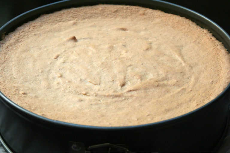 Dno tortownicy (o średnicy około 25cm) wyłóż pergaminem. Gotowe ciasto delikatnie przełóż do przygotowanej formy i umieść je w piekarniku na 180 stopni, czas: około 30.