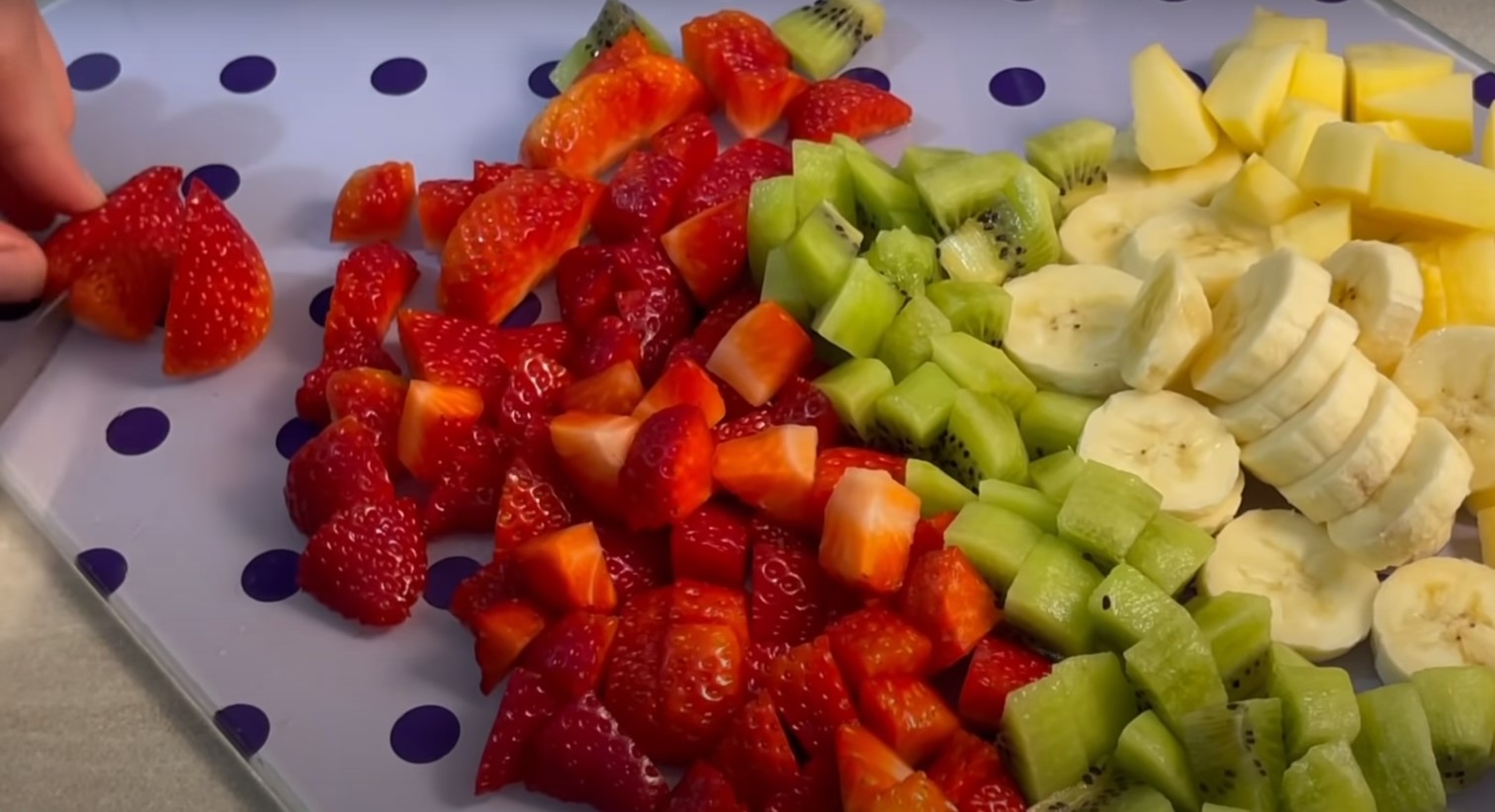 Etap 1: Umyj dokładnie wszystkie owoce, a następnie pokrój je na małe kawałeczki (najlepiej kwadraty). Po pokrojeniu, skrop wszystko sokiem wyciśniętym z jednej cytryny, aby owoce nie zmieniły koloru.