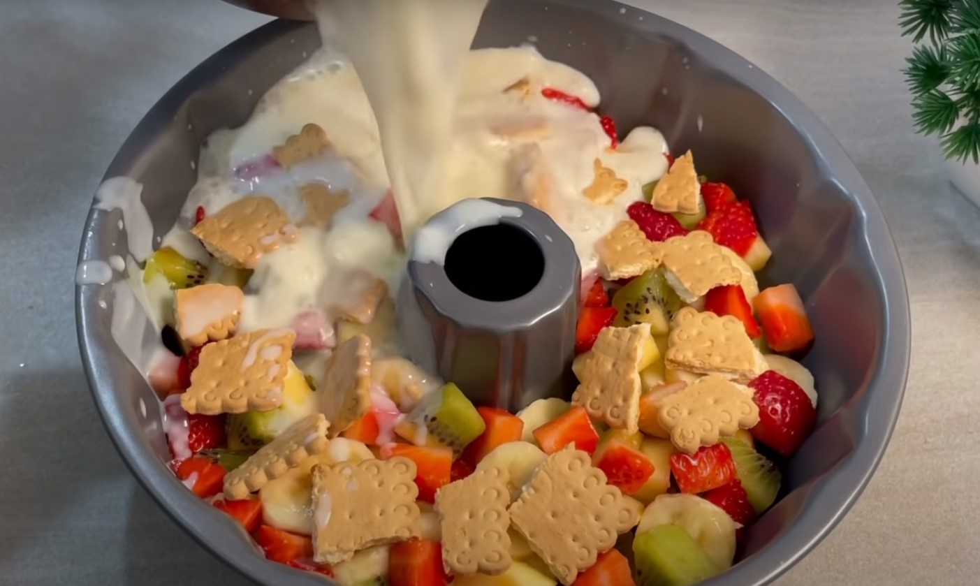 Etap 3: Na wcześniej przygotowanej formie ułóż owoce, dodaj pokruszone ciastka, a na koniec polej wszystko ugotowanym budyniem. Całość włóż do lodówki na około 2 godziny i przykryj folią spożywczą.