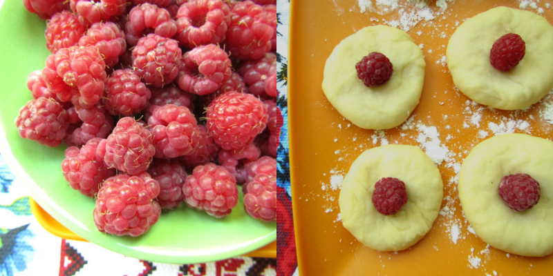 Na środku każdego kawałka, umieść maliny, a następnie złącz krawędzie i ciasto zawiń w kulkę.