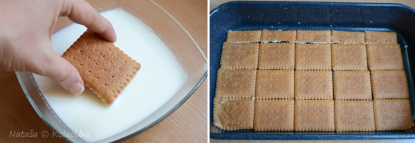 Na dno formy (może być taka jak do pieczenia ciasta) dajemy zanurzone w mleku herbatniki układając je jeden obok drugiego.