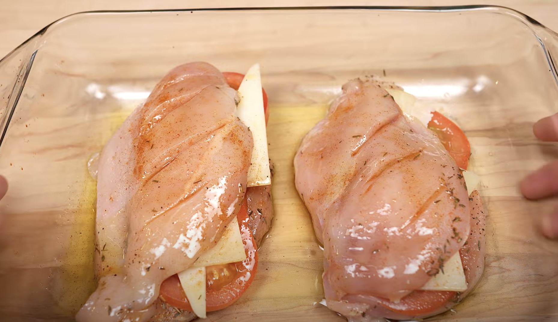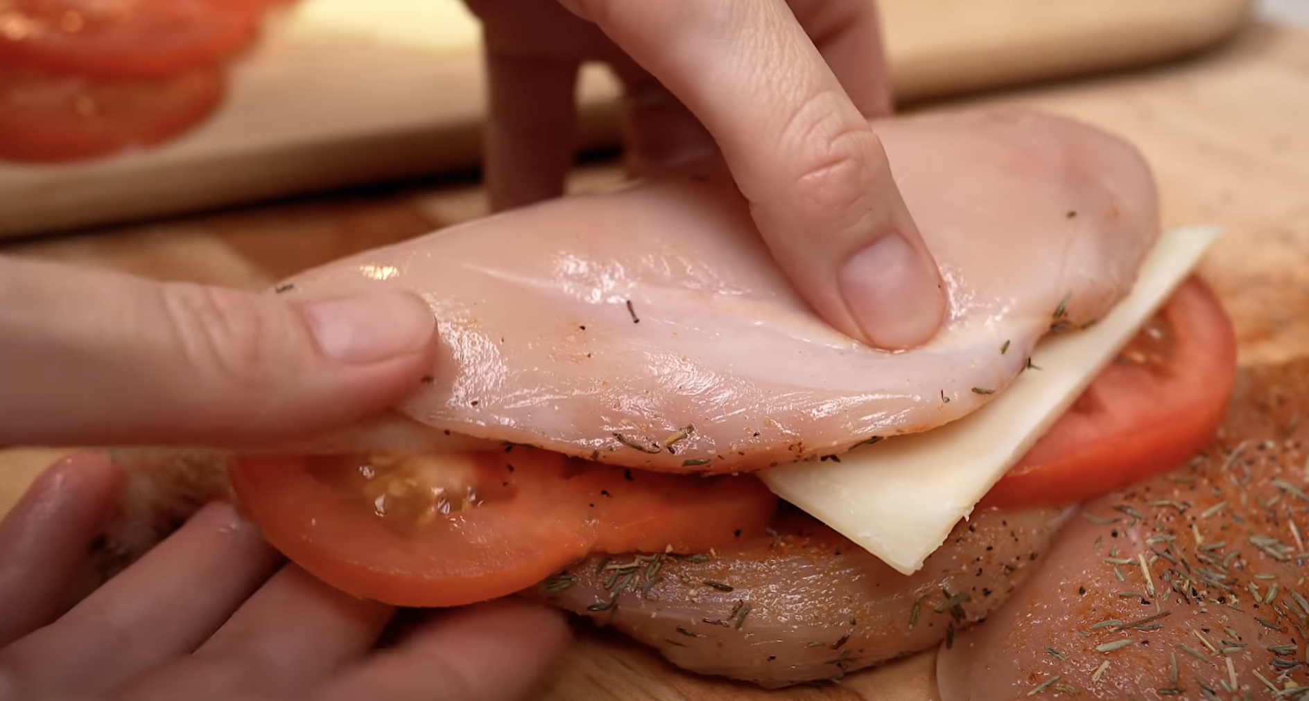 Do każdej piersi włóż po 2 plasterki pomidora i sera. Każdy kawałek mięsa natnij z wierzchu 3 razy.