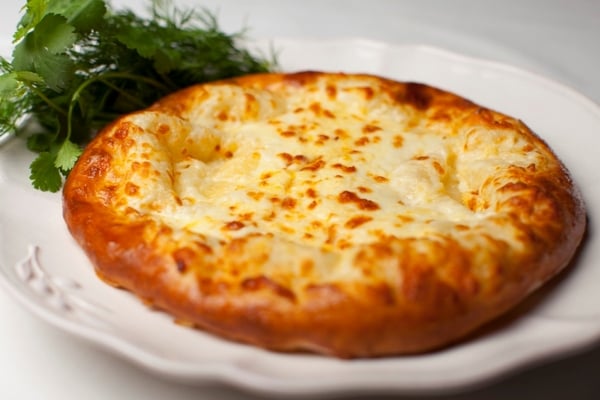 Dodaj twarożek, szczyptę soli, dwa przeciśnięte przez praskę ząbki czosnku i dobrze wymieszaj nadzienie. Podziel je na 4 części. Ciasto także podziel na 4 części i każdą rozwałkuj na placek o grubości 5 mm. Połóż nadzienie na środku, zawiń je w ciasto tworząc kulkę i ponownie rozwałkuj na placek.