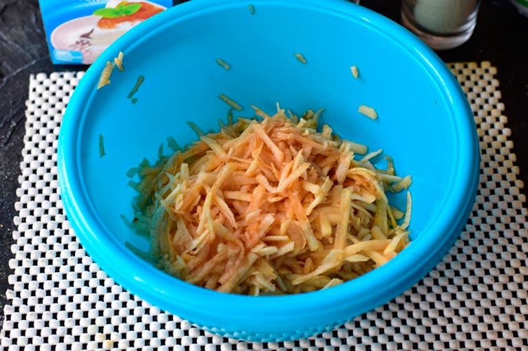 Sposób przygotowania placuszków jest banalnie prosty. Rozpocznij od obrania jabłek i starciu ich na tarce o grubych oczkach.