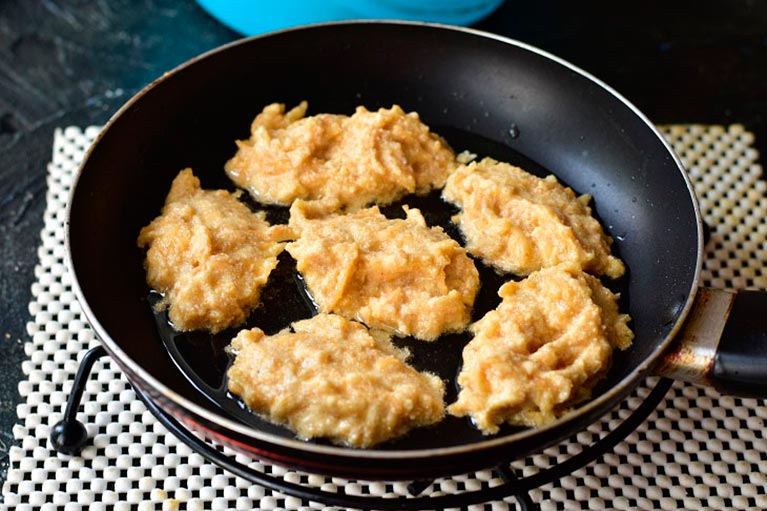 Do uzyskania chrupiących placuszków nakładaj ciasto na rozgrzaną patelnie. Placki smaż na oleju roślinnym po około 2-3 minuty z każdej strony.