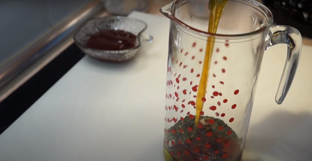Najpierw przygotujemy marynatę. Do miski włóż ząbki czosnku, dodaj tymianek, posiekaną natkę pietruszki. Wlej sok pomarańczowy, sok z cytryny i oliwę z oliwek. Na koniec wymieszaj czerwoną paprykę, zmielony czarny pieprz i miód. Mieszamy go w zwartą mieszankę za pomocą blendera. Dodaj sól do smaku i sos sojowy.