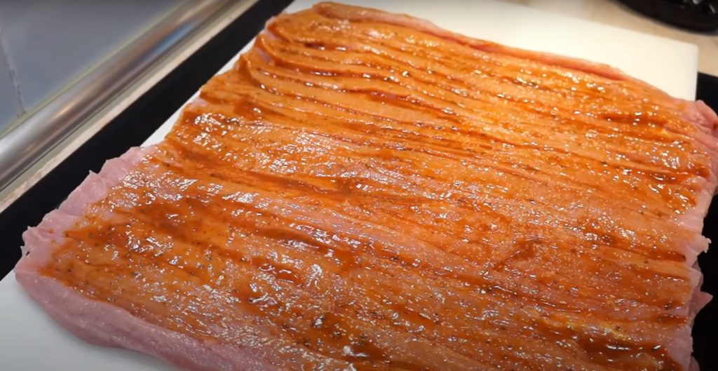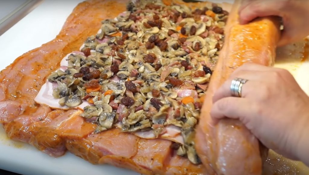Marynowaną polędwicę przenosimy na blat i rozwijamy. Na wierzch połóż plastry boczku i nałóż na niego przygotowane nadzienie.