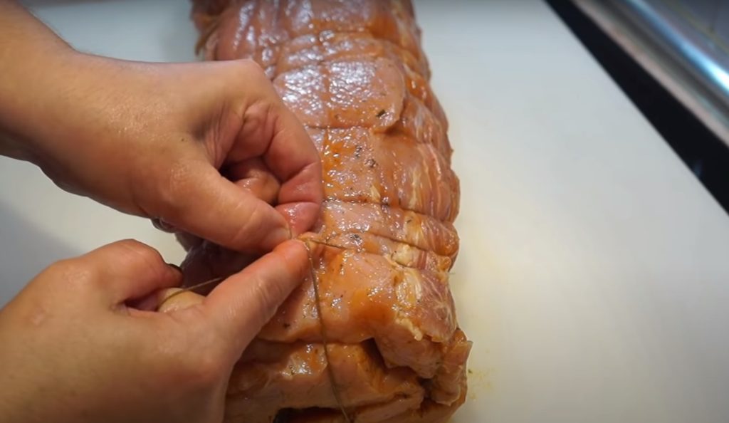 Całą roladę ze sznurkiem przewiązujemy tak, aby się nie rozpadła, a wypełnienie nie wyciekło.