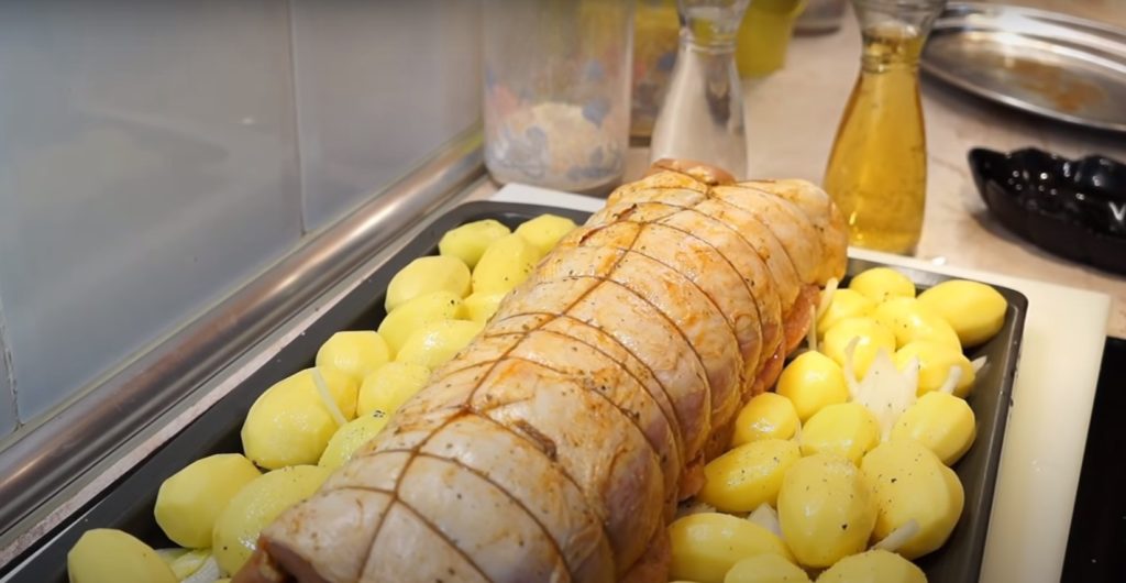 Ziemniaki polać oliwą. Następnie wszystko polewamy winem i wodą. Na koniec posmaruj roladę pozostałą marynatą. Piec w temperaturze 200°C przez około 40 minut z grzaniem górnym i dolnym.