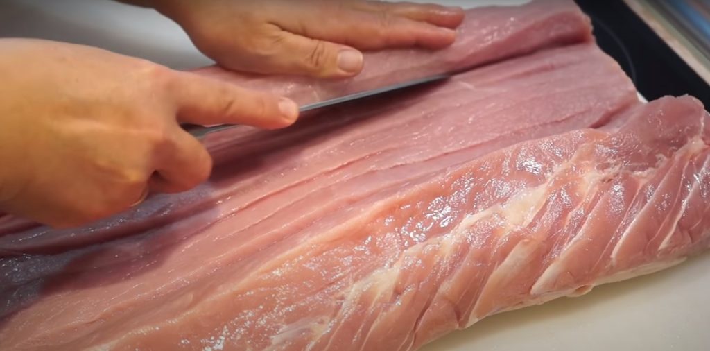 Następnie powoli zwijamy i odcinamy brzeg tak, aby powstał cienki naleśnik mięsny. Zrobimy to samo po drugiej stronie.