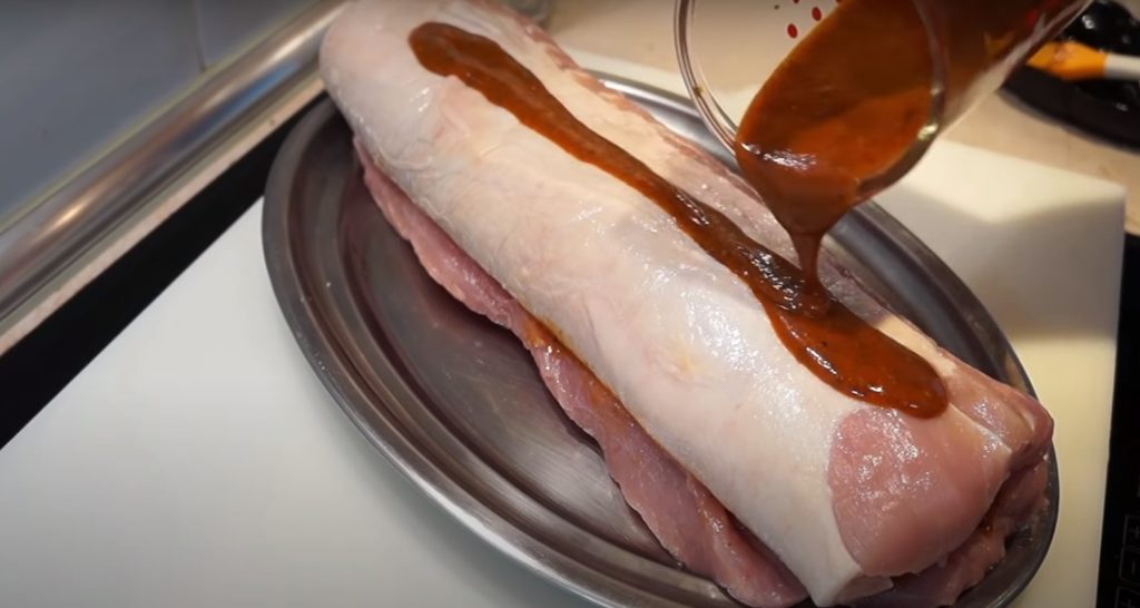 Mięso zwijamy, kładziemy na tacy i rozprowadzamy dwie trzecie marynaty na wierzchu.