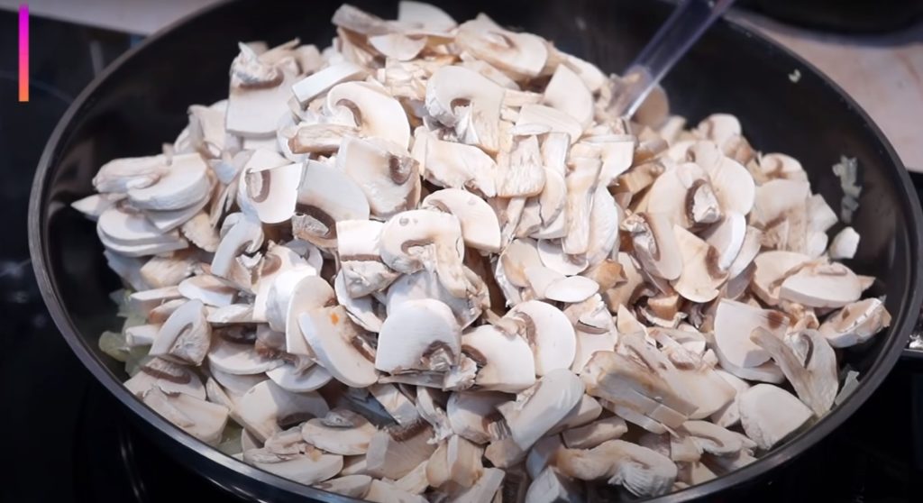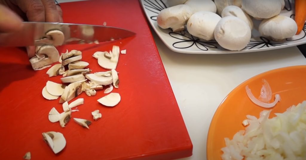 Roladę wkładamy do lodówki na 4 godziny. W międzyczasie przygotuj nadzienie. Umyj pieczarki, oczyść cebulę i drobno pokrój. Następnie pokrój również grzyby.