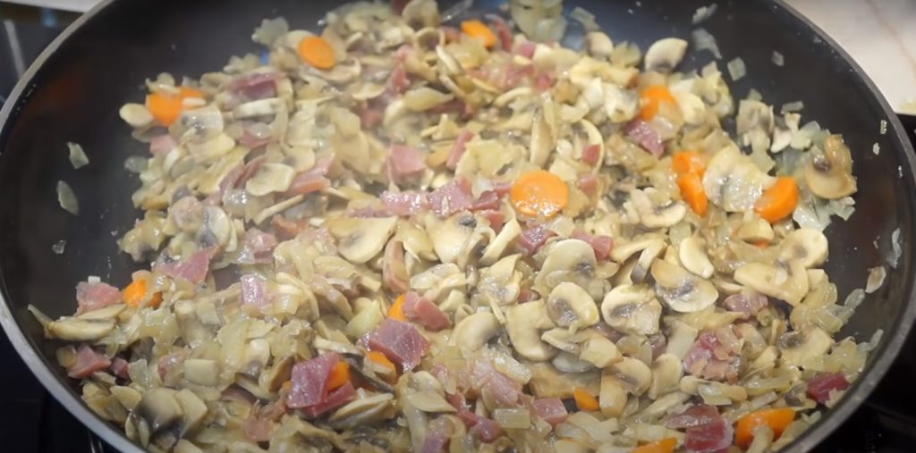 Wlej olej na patelnię i pokrój czosnek na małe kawałki. Do oleju dodajemy czosnek i smażymy. Następnie dodaj posiekaną cebulę i marchewki. Sól dla smaku. Po chwili dodaj pieczarki.