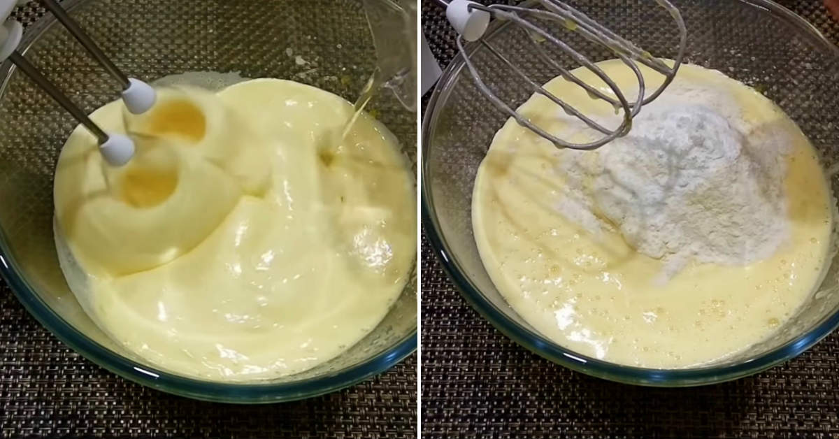 Przede wszystkim przygotujmy ciasto. Wbij jajka do głębokiej miski. Posyp je cukrem i wymieszaj trzepaczką. Dodaj szczyptę soli i roztopione masło. Zamieszaj ponownie. Teraz dodaj do mieszanki śmietanę i wanilię. Mieszaj składniki, aż będą gładkie. Mąkę wymieszać z proszkiem do pieczenia. Przesiej je do miski z płynną masą. Zagnieść jednorodne ciasto.