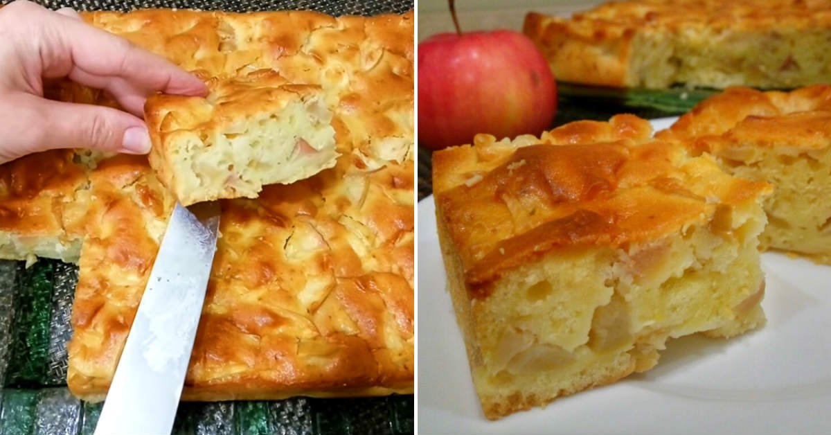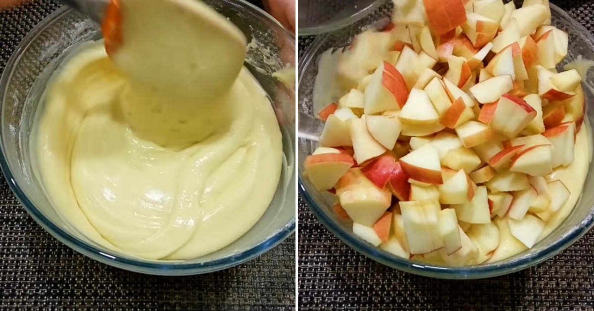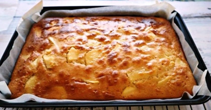 Jabłka obrać ze skórki i rdzeni. Miąższ pokroić w plastry lub duże kostki. Dodaj jabłka do ciasta, wszystko wymieszaj. Wyłóż naczynie do pieczenia pergaminem. Wylej na nią ciasto, rozprowadź równomiernie na powierzchni. Ciasto pieczemy w piekarniku nagrzanym do 180 stopni przez około 20 minut.