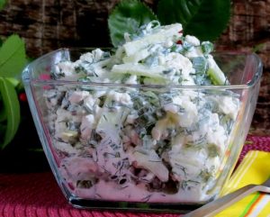 • Wersja z twarożkiem: Z sokiem z cytryny, 250 g niskotłuszczowego twarogu, 100 g jogurtu naturalnego, marchwią, jabłkami i ogórkami: Wszystkie składniki drobno pokrojone lub zetrzeć na tarki. Dodaj twaróg, sok z cytryny, jogurt, łyżkę miodu – i czuj prawdziwą eksplozję smaku