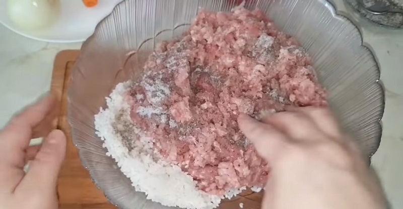 Połowę przygotowanego warzywnego farszu połącz z ryżem i mięsem mielonym. Drugą zostaw na patelni na sos. Będziesz potrzebne do niego około 0,5 litra wody, sól oraz pieprz. Poczekaj aż będzie wrzeć. Odstaw na chwilę, aby mógł dobrze wystygnąć.