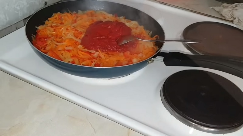 W międzyczasie przygotowuj farsz. Ryż zalej wrzątkiem i połącz z mięsem mielonym. Dodaj przyprawy według własnego upodobania. Cebulę i marchewkę pokrój w drobniutką kosteczkę. Smaż na oleju około 5-7 minut. Następnie pokrój drobno paprykę i wsyp na patelnię. Na podsmażone warzywa wylej koncentrat pomidorowy, ciągle mieszając smaż przez około 2 minuty.