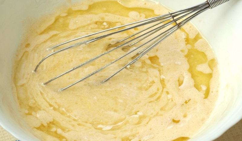 Włączamy piekarnik i nastawiamy na 180 stopni. Masło roztapiamy w rondelku. Następnie dodajemy cukier i mieszamy aż się roztopi. Odstawiamy do ostygnięcia. Kiedy masło z cukrem będzie już letnie dodajemy jajka i ubijamy. Dodajemy śmietanę i wszystko mieszamy.