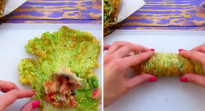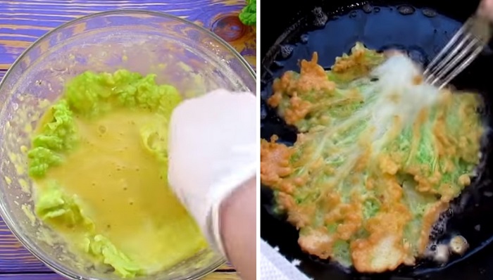 Liście kapusty po kolei maczamy w gotowym cieście, po czym obsmażamy je z obu stron na rozgrzanym oleju. Aby odsączyć nadmiar tłuszczu, możemy liście przełożyć na ręcznik papierowy.
