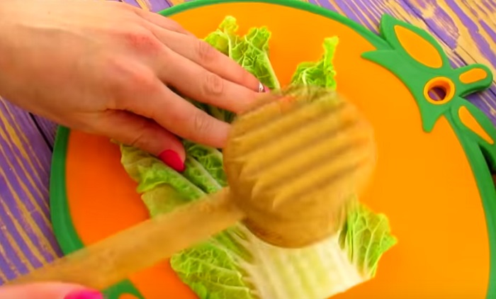 Liść kapusty rozkładamy płasko na blacie. Na jednej jego krawędzi umieszczamy trochę nadzienia i ciasno zawijamy.