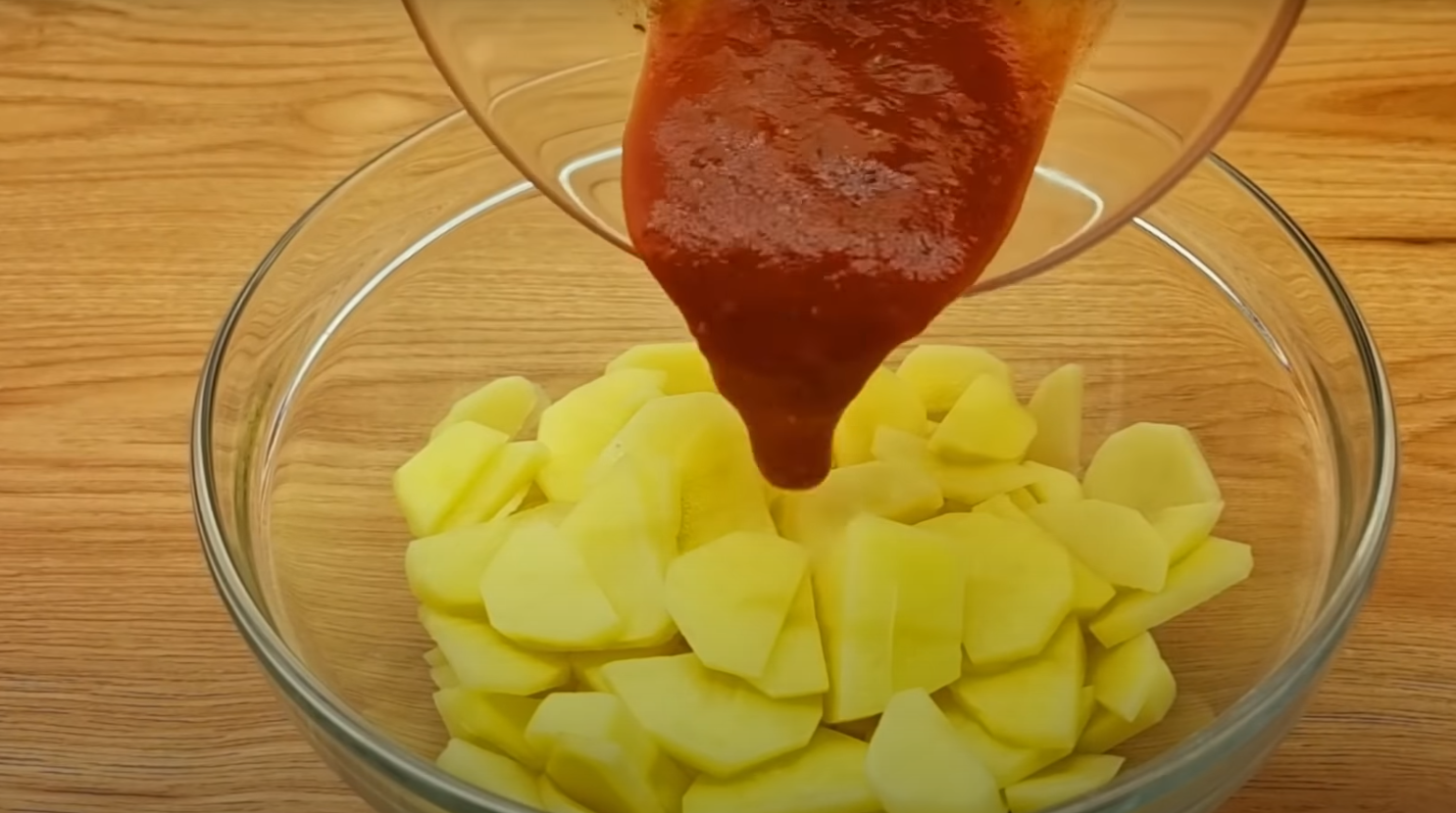 Ziemniaki należy dokładnie umyć i pokroić na mniejsze kawałki. Następnie należy dodać do tego zmieszany z przeciśniętym przez praskę ząbkiem czosnku, solą, przyprawami i ziołami koncentrat lub przecier pomidorowy i solidnie wymieszać. Przygotowane w ten sposób ziemniaki należy wyłożyć na blasze do pieczenia posmarowanej tłuszczem i piec w piekarniku przez 35 minut w temperaturze 200 stopni.