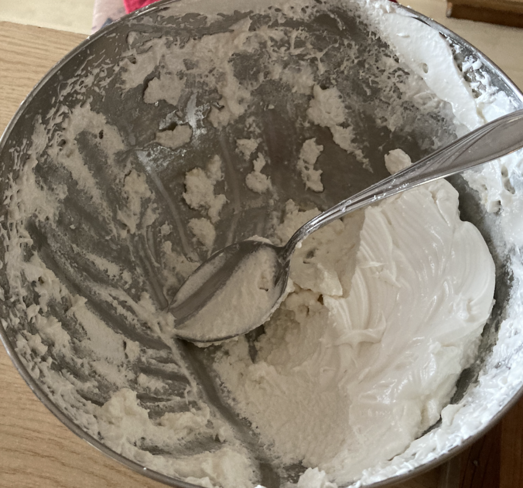 Roztopiony cukier bardzo powoli wlewaj do białek cały czas ubijając, by powstała jednolita masa. Przed nadziewaniem ciastek, krem dobrze włożyć na chwilę do lodówki.