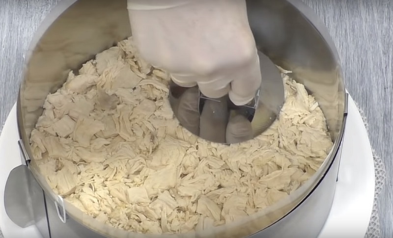 Spód wyłóż warstwą ugotowanego, pokrojonego kurczaka i przesmaruj majonezem. Posyp poszatkowanymi ziołami. Kolejno posyp wiórkami cebuli, którą wcześniej przygotowaliśmy w zalewie i znów przesmaruj majonezem. Kolejną warstwę wykonaj z gotowanej marchewki.