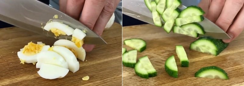 Ugotuj jajka na twardo i obierz je ze skorupek. Umyj ogórki. Obie te rzeczy pokrój w drobną kosteczkę.