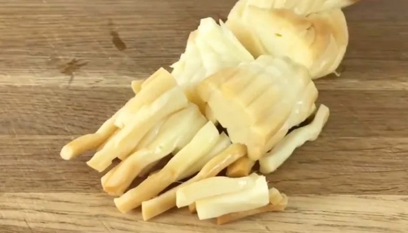 Na desce połóż warkoczyki serowe i podziel je nożem na paseczki.