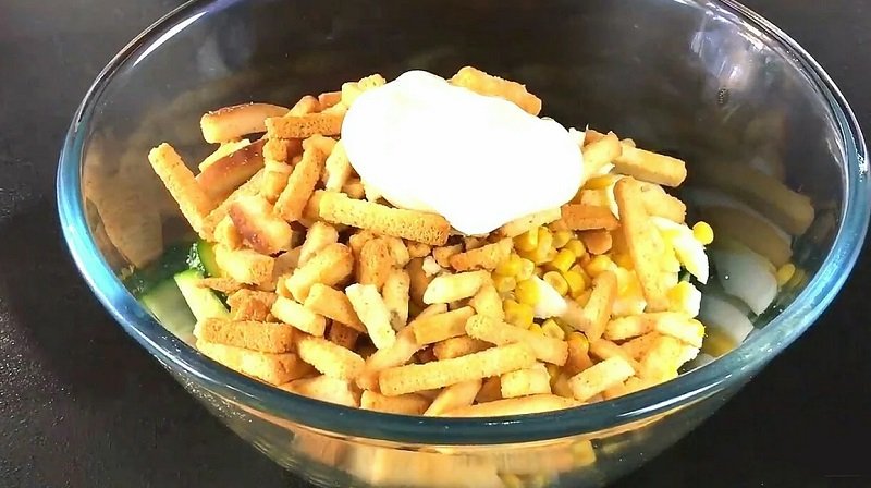 Dopraw zawartość majonezem wedle uznania. Oczywiście, dodaj grzanki. Wymieszaj dokładnie wszystko raz jeszcze.