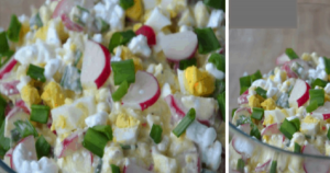 Zacznij od ugotowania czterech jajek. Pozostaw je do ostygnięcia. Obrać i pokroić w kostkę. Twarożek należy odsączyć, aby sałatka nie stała się zbyt wodnista.