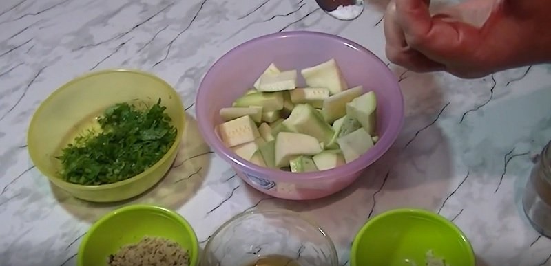 Cukinie po umyciu należy dokładnie obrać ze skórki i pozbyć się z niej nasion. Jeśli cukinia jest młoda to nie trzeba tego robić. W następnym etapie należy warzywo pokroić w średnią kostkę, aby nie była ona zbyt drobna.