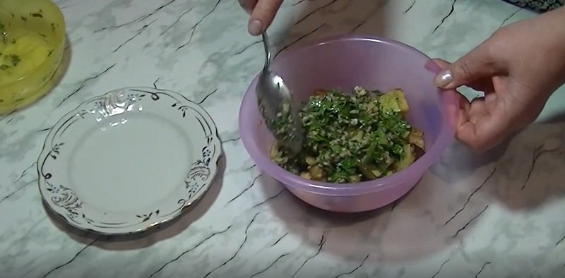 Po usmażeniu, warzywa ułożyć na formie, w której będą one serwowane. W celu przygotowania dressingu, wystarczy przecisnąć przez praskę czosnek wraz z posiekaną natką pietruszki. Wsypać do tej mieszanki zmiażdżone włoskie orzechy oraz sól do smaku.